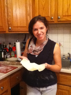 While the dough sat for an hour, we cut up he mozzarella cheese, mushrooms, and began cooking the tomato sauce. I think we took a wrong turn when the recipe called for "several glugs of red wine"- I definitely put more than that in the pot and the tomato sauce remained a liquid consistency despite lots of boiling. To thicken up the tomato sauce, we made a "roux" - a mixture of butter and flour That cooks to a doughy consistency and can be melted into the sauce. That trick miraculously worked, and we were left with a delicious large quantity of tomato sauce.